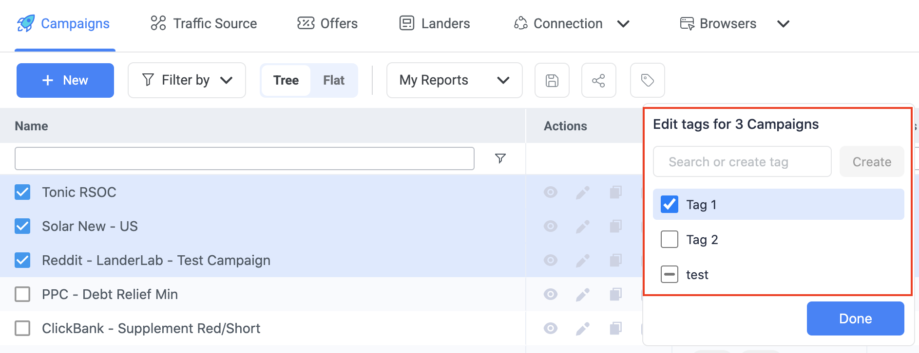 You can also create, assign, or remove tags in bulk directly from any list or reporting view (for example, Campaigns).