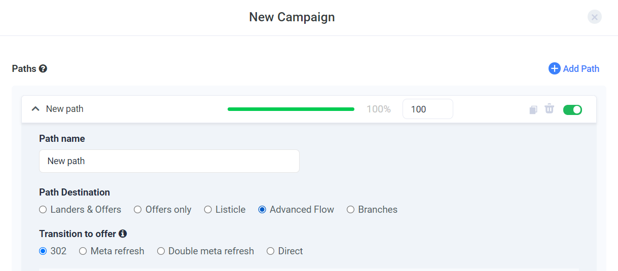 A campaign can direct a visitor to different paths and options to maximize its profits. When creating a new campaign you can choose between 5 options of where to direct your traffic. In this article, we'll look at how you can set up a campaign when redirecting traffic through an advanced flow.