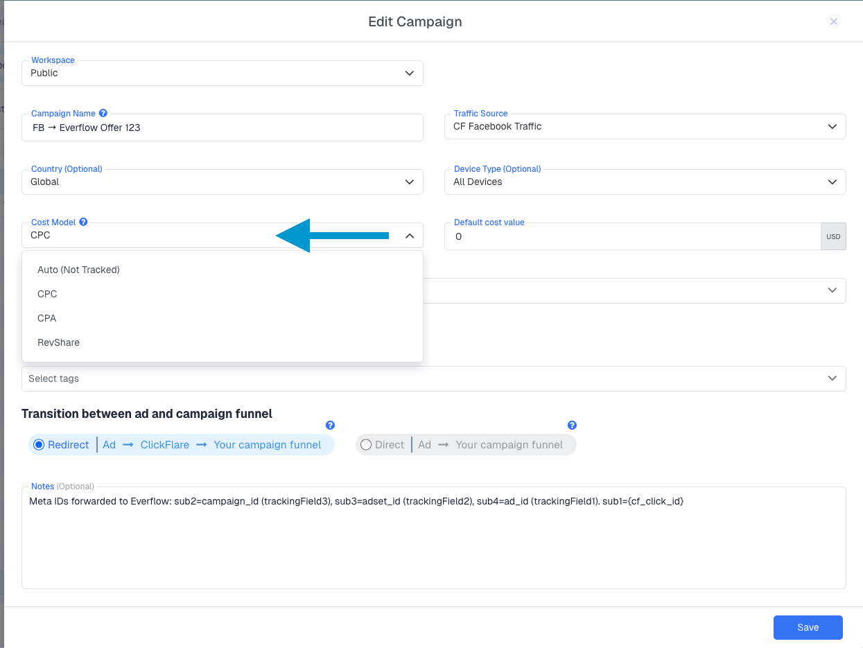 A5: Yes. The cost model is set per campaign, not per traffic source. You can have one campaign on Facebook using CPC at $0.05 and another on Facebook using RevShare at 20%, and ClickFlare will calculate each independently.