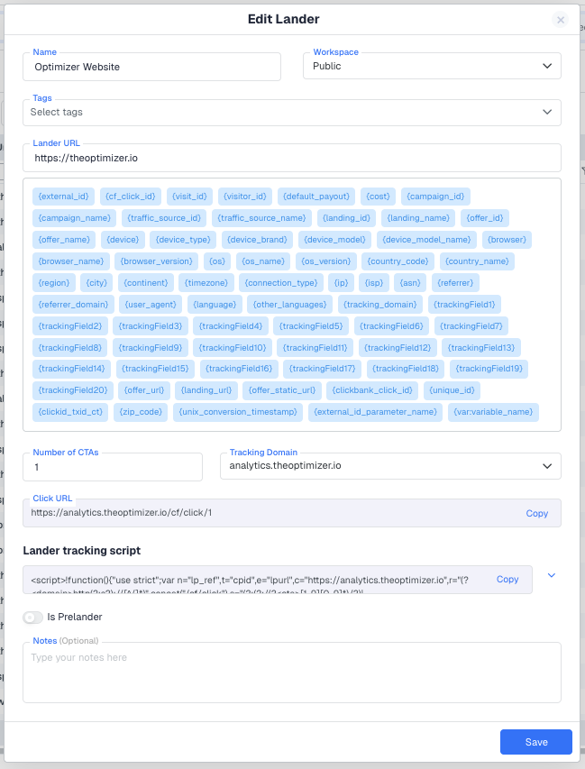 Name is an internal label used to identify the lander in dropdowns and reports throughout ClickFlare. It does not appear to visitors. Workspace controls which team members or clients can access this lander. If no workspace is selected, the lander defaults to Public and is visible to everyone in the account.
