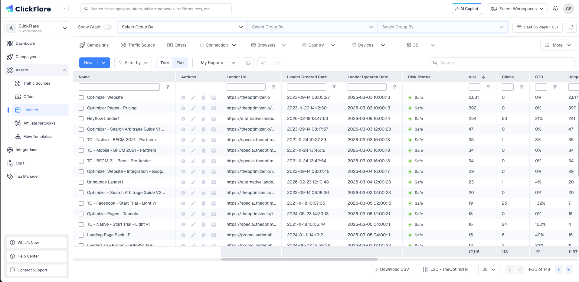 A4: Yes. A lander is a reusable asset. Add it to ClickFlare once and select it across as many campaigns as needed. Each campaign tracks visits and clicks independently, but the Landers list view shows aggregated stats across all campaigns.