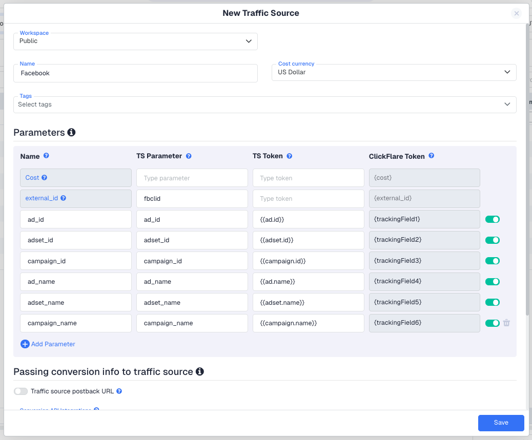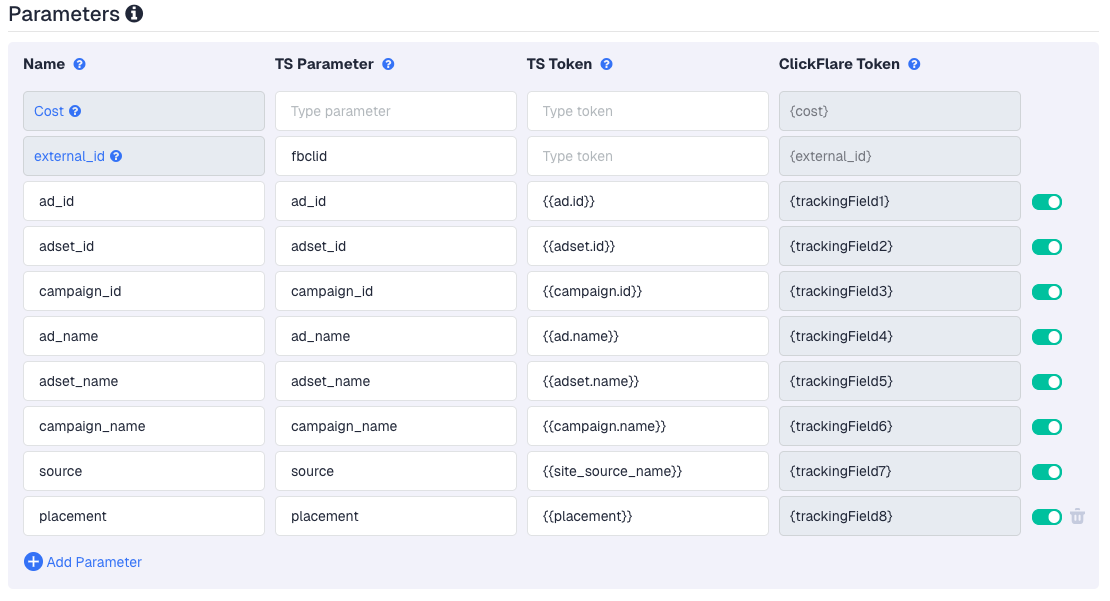 Parameters are the core of the traffic source configuration. Each parameter maps a token provided by your ad platform to a named variable that ClickFlare stores against every visit.