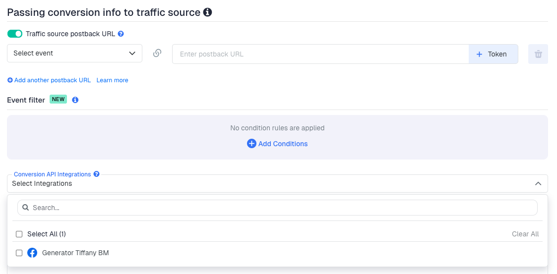 - Conversion API (CAPI): available for supported platforms such as Meta and TikTok. CAPI is a deeper, more reliable integration that sends conversion data directly via the platform's API rather than a postback URL. Select the relevant integration from the dropdown.