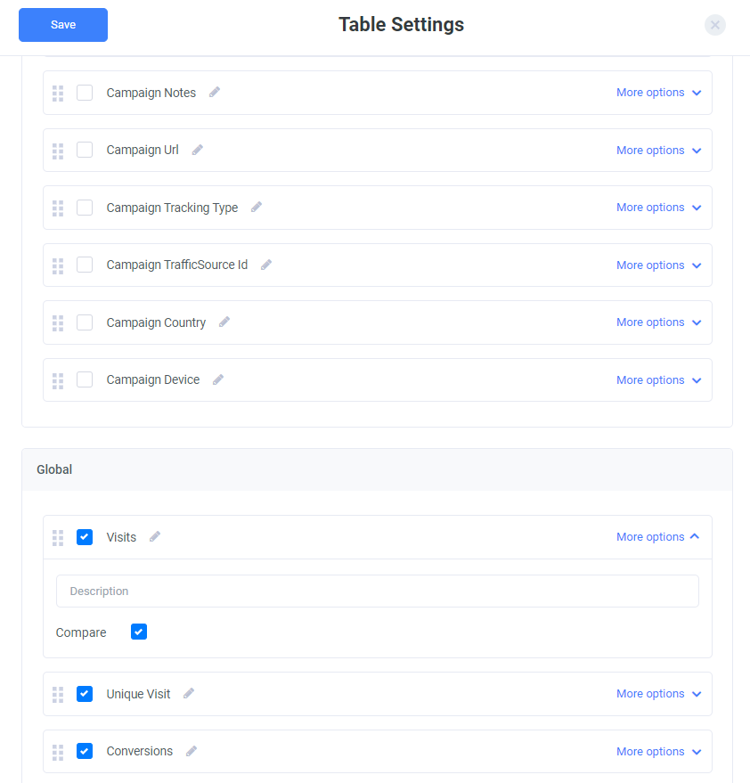 On the Table Settings section that appears, you can easily reposition your columns by simply either dragging and dropping them, or selecting which of the columns will appear.