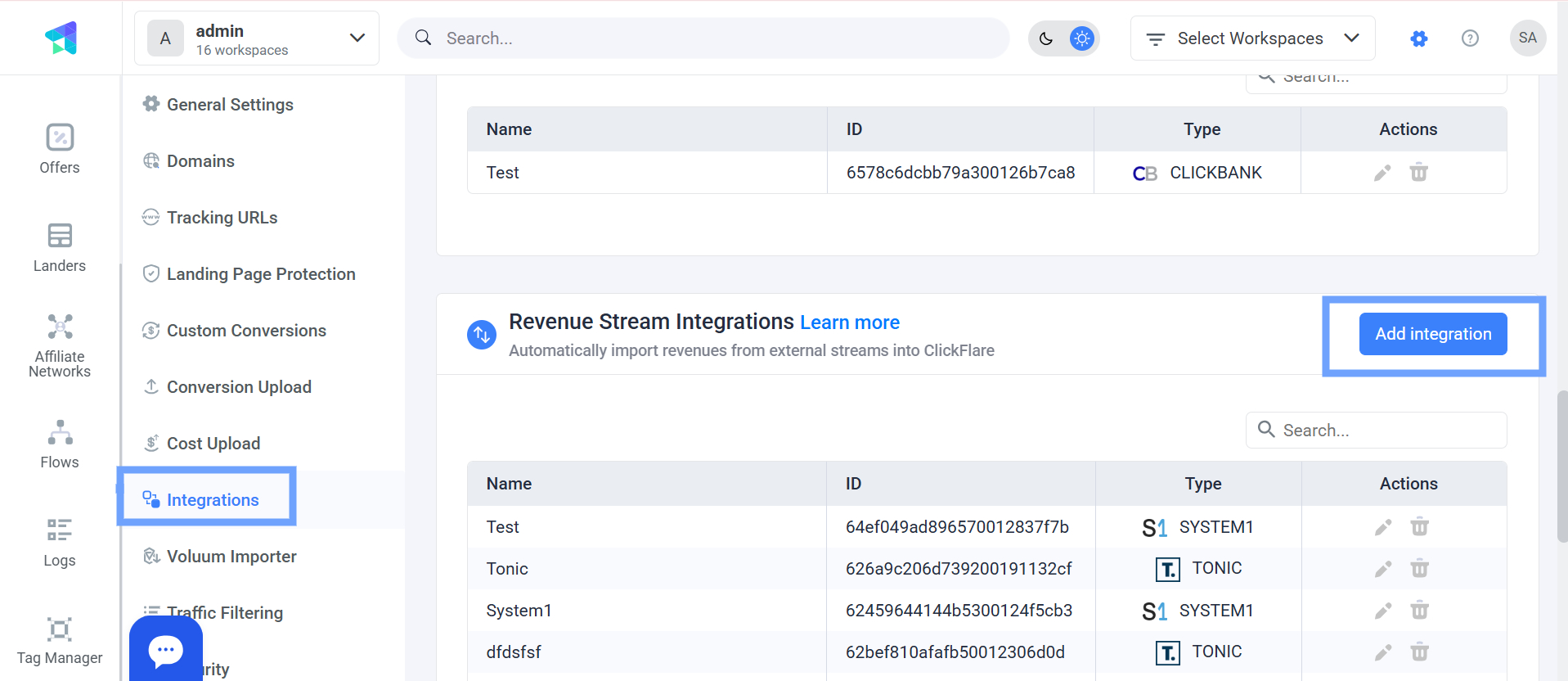 Go to the Settings menu (gear icon) in your ClickFlare dashboard and click on Integrations.