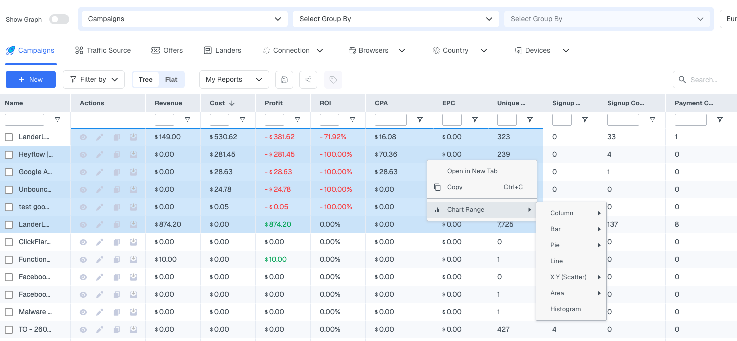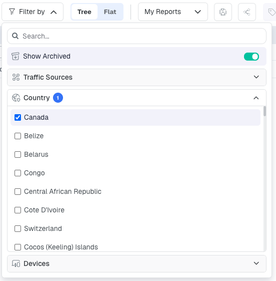 This is one of the most powerful features in ClickFlare for diagnosing performance. For example, grouping a campaign's data by Country shows you which geos are driving conversions vs. which are burning cost. Grouping by Hour of Day shows you your best and worst performing hours so you can schedule your ads accordingly.