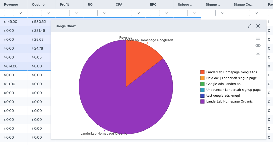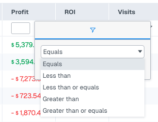 Sorting by Profit descending is a quick way to see your most profitable campaigns at the top. Sorting by Cost descending shows where your budget is going. Sorting by ROI ascending surfaces your worst-performing campaigns immediately.