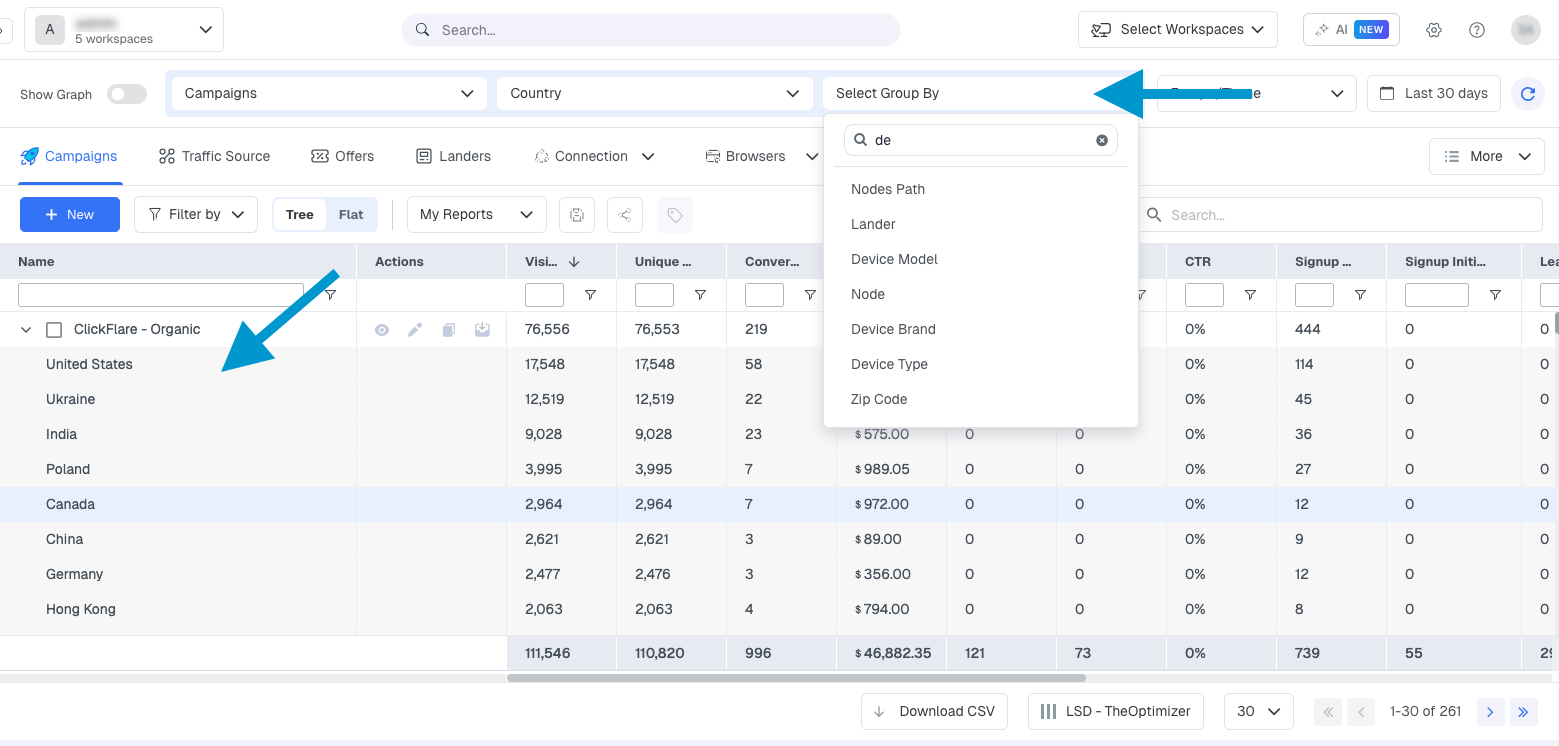 Group By changes how the table organises its rows. Instead of listing campaigns, you can group the same data by country, device type, traffic source, day, hour, browser, OS, or dozens of other dimensions.
