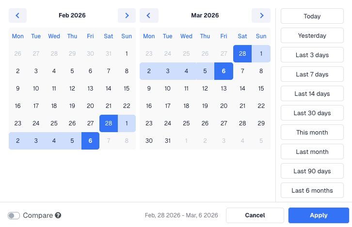 Every table is scoped to a date range. The selector sits in the top-right corner of the screen and defaults to the last 30 days. Click it to choose a preset (Today, Yesterday, Last 7 Days, Last 30 Days, This Month, Last Month, Last 3 Months, Last 6 Months) or pick a custom start and end date from the calendar.