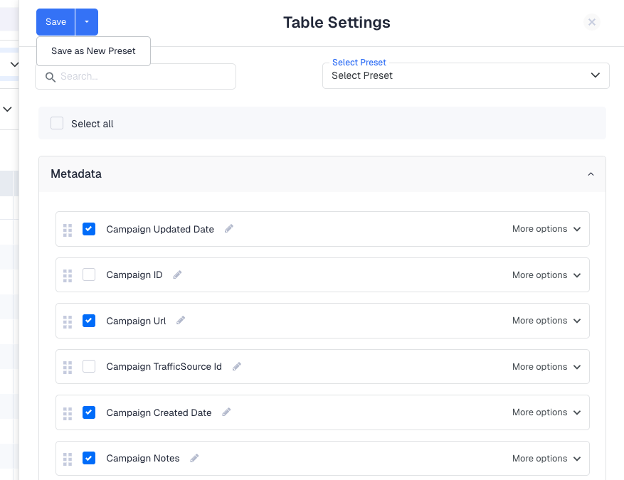 If you regularly switch between different column configurations, save each one as a preset using the Select Preset option at the top of the Table Settings panel. You can then switch between saved layouts in one click without reconfiguring manually.