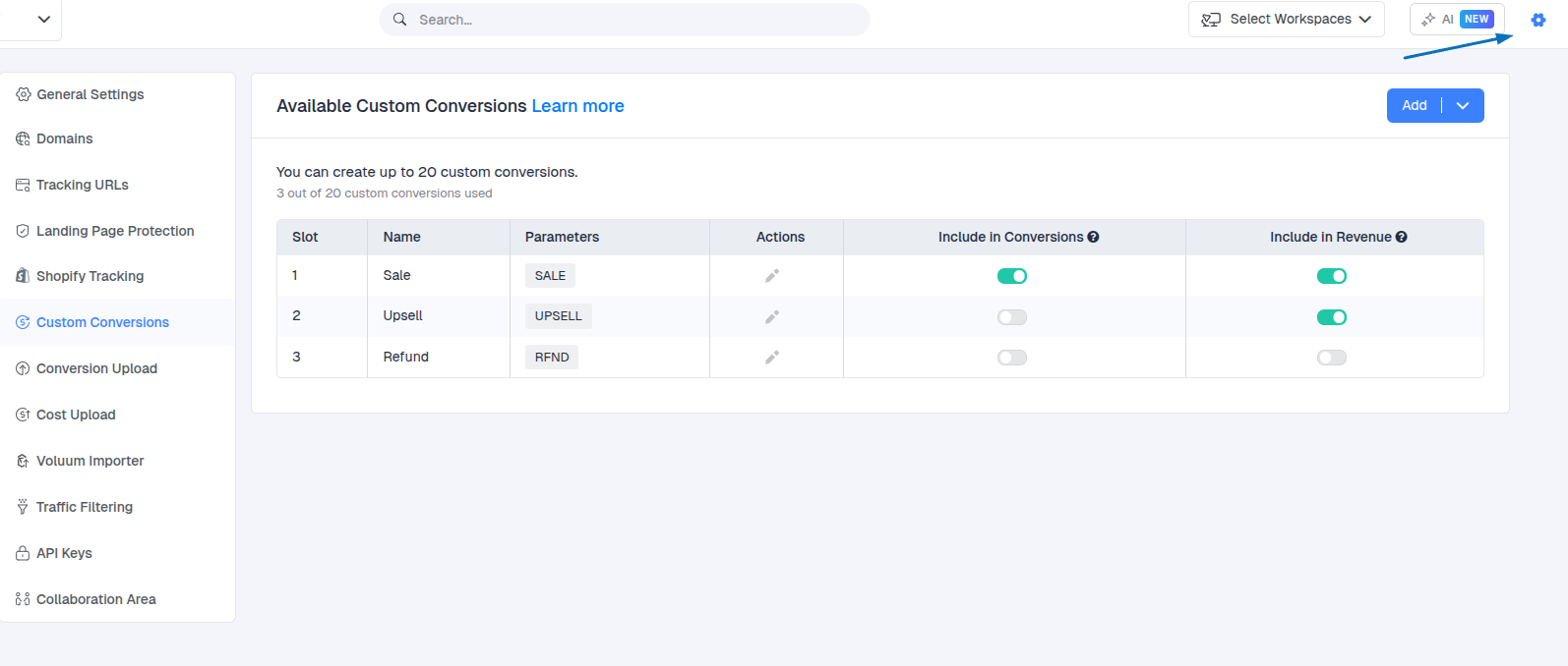 - Add a custom conversion for each type. You don't have to set up all custom conversions listed above, just the ones you want to see in ClickFlare reports.