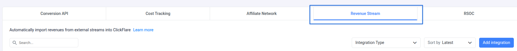 - Under Revenue Stream, click Add Integration.