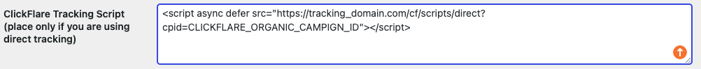 Paste the ClickFlare Direct Tracking Script in the field at the top only if you are using Direct Tracking (Google Ads, Bing, direct-to-store flows, or organic traffic). -