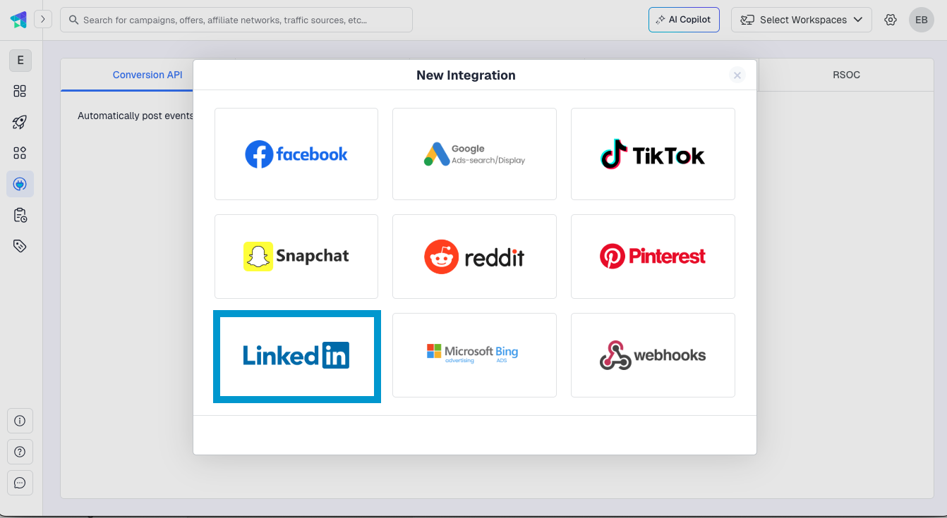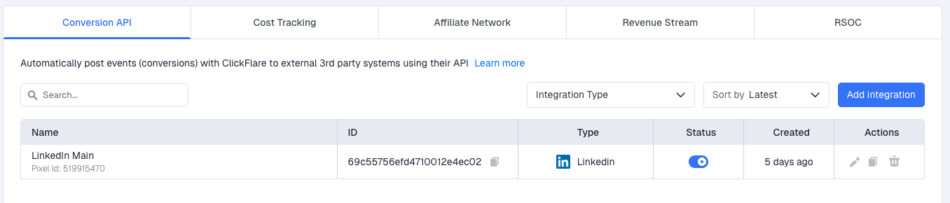 - Inside ClickFlare, go to Integrations from the left-hand sidebar menu and navigate to the Conversion API tab. Click Add Integration and select LinkedIn from the list.
