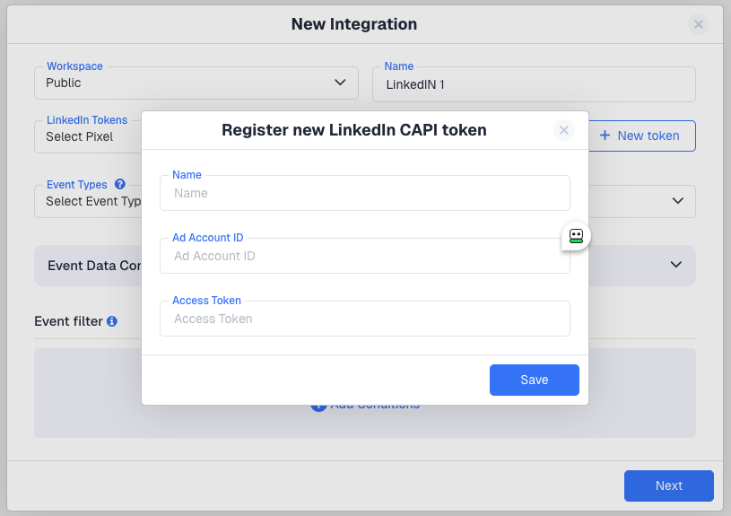 - In the Register new LinkedIn CAPI token dialog, enter a Name for the token, your Ad Account ID, and the Access Token you generated in LinkedIn Campaign Manager. Click Save.