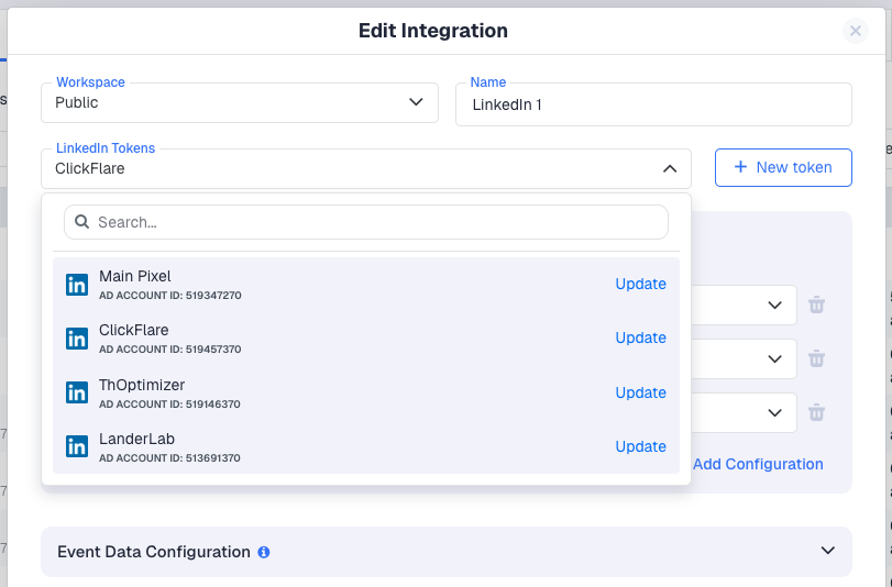 A6: Generate a new Access Token in LinkedIn Campaign Manager. Then in ClickFlare, go to Integrations → Conversion API, find your LinkedIn integration, click Update in the LinkedIn Tokens dropdown, and paste the new Access Token.