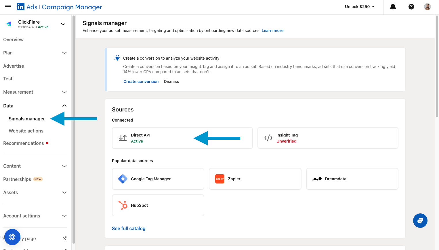 - In LinkedIn Campaign Manager, click Data in the left-hand menu, then click Signals manager.