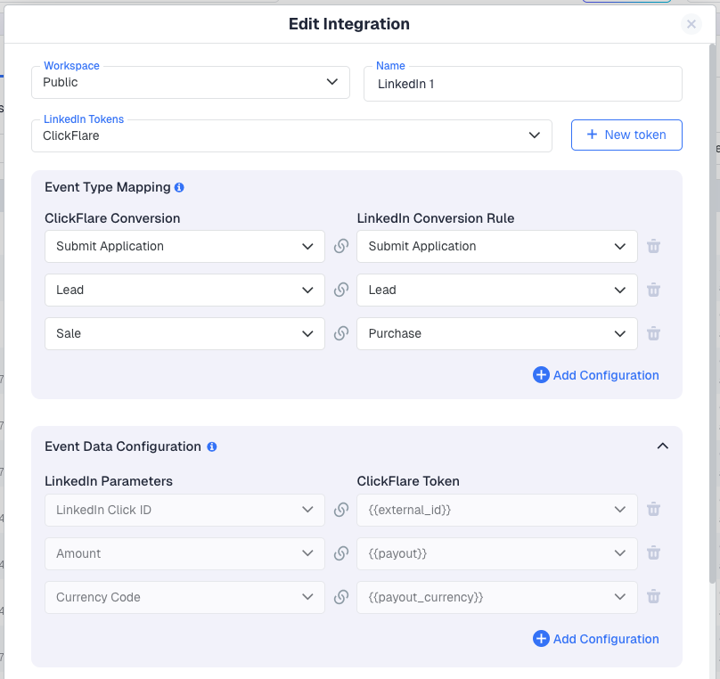 LinkedIn Parameter ClickFlare Token Description LinkedIn Click ID {{external_id}} Maps the LinkedIn click identifier for accurate attribution Amount {{payout}} Sends the conversion value/payout amount Currency Code {{payout_currency}} Sends the currency of the conversion value You can add additional mappings by clicking + Add Configuration.