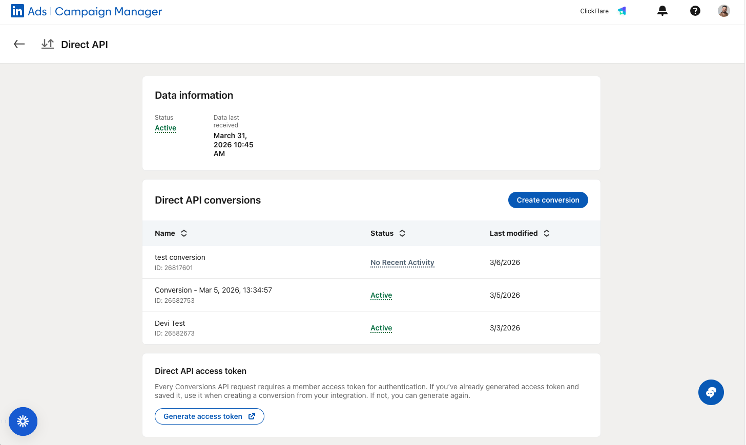 A4: In LinkedIn Campaign Manager, go to Data → Signals manager → Direct API, scroll to the Direct API access token section, and click Generate access token. Then in ClickFlare, go to Integrations → Conversion API, find your LinkedIn integration, click Update in the LinkedIn Tokens dropdown, and paste the new token.