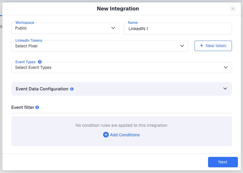 - Set the Workspace, enter a Name for the integration, and under LinkedIn Tokens, click + New token to register your LinkedIn CAPI credentials.