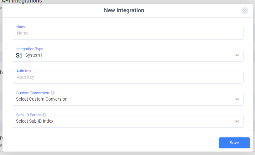 - Begin by naming your integration and select System1 from the list of supported Integration Types.