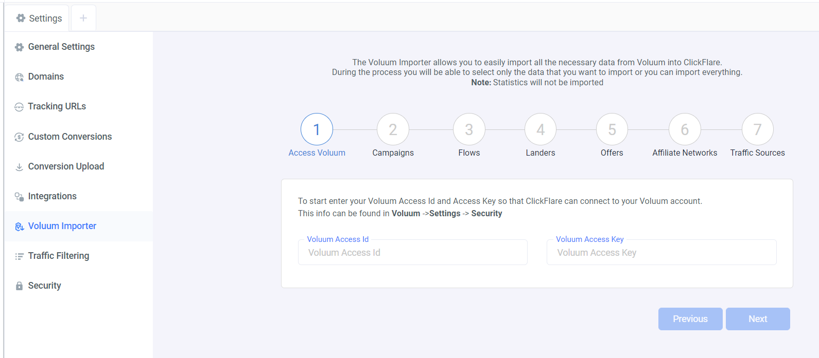 If you'd like to import your data, such as your campaigns, flows, landers, offers, affiliate networks and traffic sources from Voluum to ClickFlare, you can easily do that by using our Voluum Importer feature.