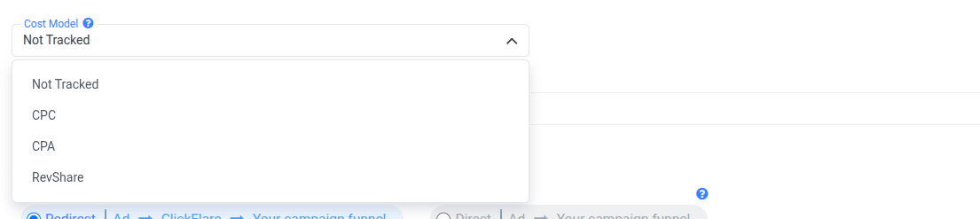 As you can see from the image above, the available Cost Models to choose from are: Not Tracked, CPC, CPA, RevShare.