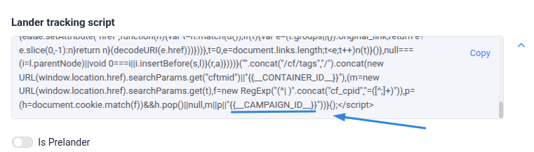Example: Replace the placeholder {{__CAMPAIGN_ID__}} in the script with your actual ClickFlare campaign ID: